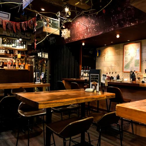 【テーブル席】木のぬくもりを感じるシックな空間。ご友人や恋人とご一緒に、または女子会や記念日など各種宴会やプライベートシーンでご利用いただけるお席をご用意しております。4名様までのお席が2つ、5名様までのお席が1つございます。